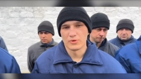 На видео 20 мужчин, облачённых в синие фуфайки и чёрные шапки. За спиной бойцов — высокая белая стена и колючая проволока.