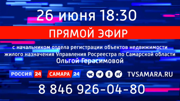 У зрителей каналов «Россия 24» и «Самара 24» сегодня, 26 июня, будет возможность задать любые вопросы по «дачной амнистии». Советами, которые наверняка вам пригодятся, в прямом эфире поделится начальник отдела регистрации объектов недвижимости жилого назначения Управления Росреестра по Самарской области Ольга Герасимова.