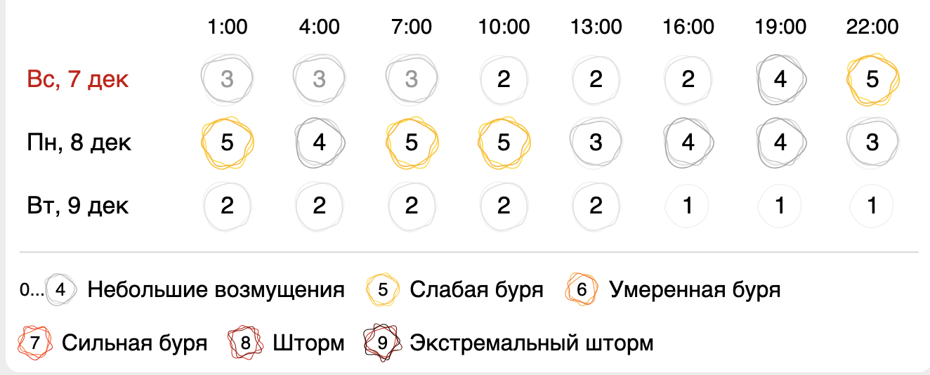 Причиной станет магнитная буря, начинающаяся 7 декабря и заканчивающаяся лишь на следующий день. В этот период уровень геомагнитной активности достигнет пяти баллов. Во второй половине дня 8 декабря напряжённость снизится до четырёх баллов, однако её воздействие на организм останется заметным.