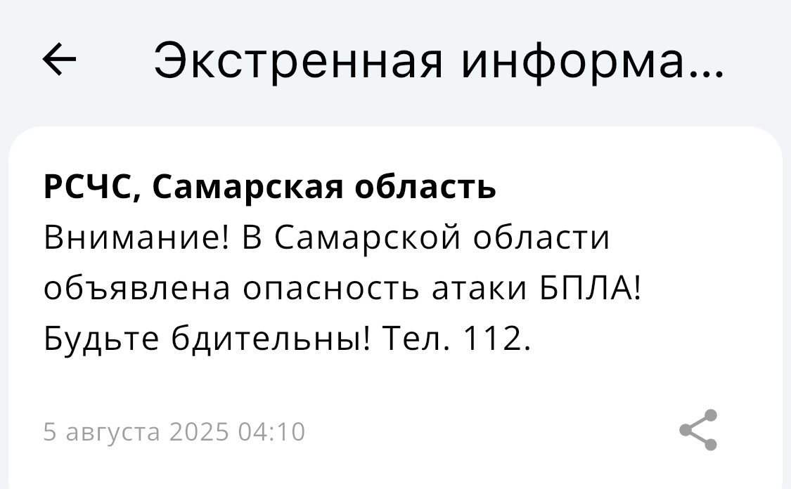 5 августа в 4 часа 10 минут Единая государственная система предупреждения и ликвидации чрезвычайных ситуаций объявила в Самарской области об опасности атаки беспилотных летательных аппаратов.