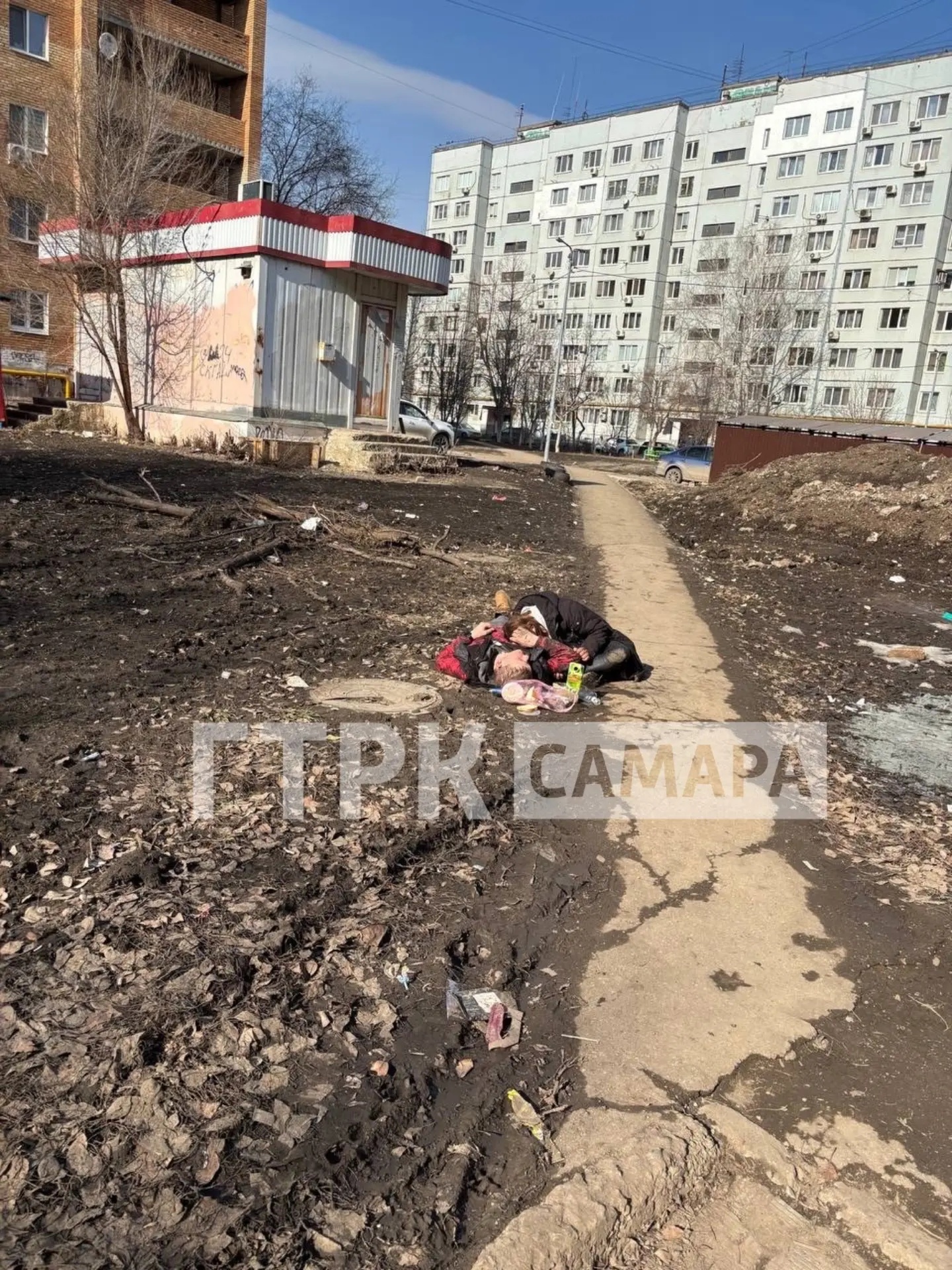 Корреспонденты ГТРК «Самара» запечатлели пару на улице Металлистов, 17Б: двое взрослых расположились прямо на пешеходной тропинке среди жилых многоэтажек, раскинув рядом пакеты с едой и личными вещами.