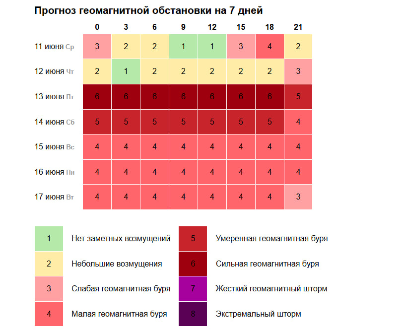 Первый удар, оцениваемый в 4 балла, начнется вечером среды, 11 июня. Потрясения продолжатся до вечера четверга, 12 июня, а затем достигнут пика в пятницу и субботу, когда мощность бури составит 5-6 баллов. После этого геомагнитная активность будет снижаться, но полностью не исчезнет до вторника, 17 июня, когда она снова достигнет 4 баллов.