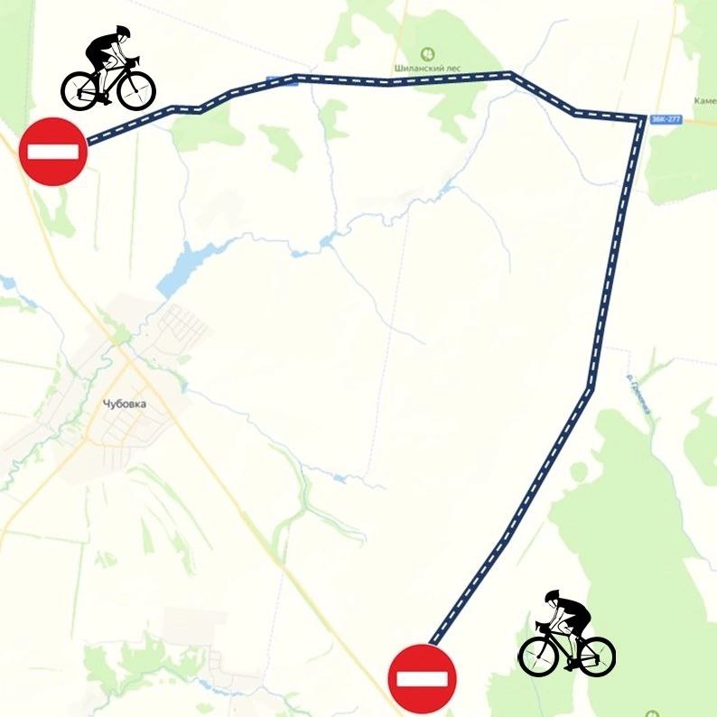 На период ограничения движения на автомобильных дорогах будут установлены временные дорожные знаки. Полный маршрут участников соревнований велосипедного спорта представлен на следующей схеме: