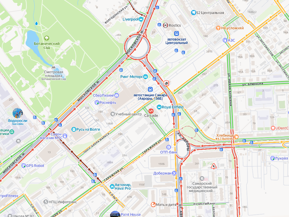 Но хуже всего ситуация сложилась на улицах Гагарина, Луначарского, Тухачевского, Чернореченской, Авроры и Ботаническом переулке. Там движение практически остановилось — цвет пробки отмечен бордовым цветом.