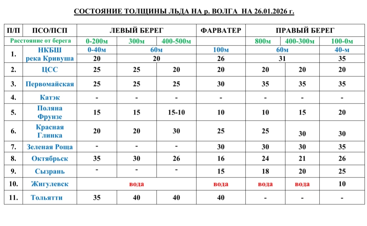 Стало известно, какова толщина льда на реке Волга в пределах Самарской области на 26 января 2026 года. Согласно показателям, она крайне неравномерна — от 35–40 сантиметров в районе левого берега у Тольятти до опасных 10–16 сантиметров на фарватере у Поляны Фрунзе и Октябрьска.