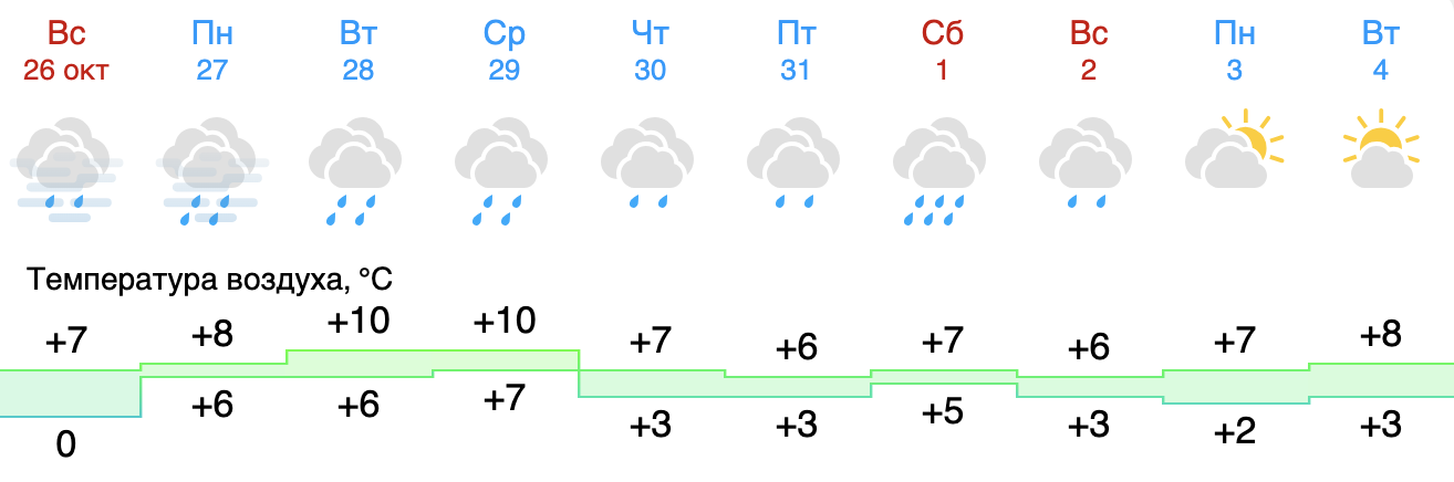 По данным портала Яндекс.Погода, в понедельник, 27 октября, температура воздуха составит около +8°C днем, обещают облачную погоду. Во вторник и среду, 28 и 29 октября, ожидается небольшое потепление до +9°C и +10°C соответственно, будет дождливая погода. К четвергу, 30 октября, температура немного снизится до +8°C. В пятницу, 31 октября, и субботу, 1 ноября, температура останется на уровне +6°C и +7°C, а осадки продолжатся. В воскресенье, 2 ноября, ожидается небольшое похолодание до +4°C, погода останется дождливой.