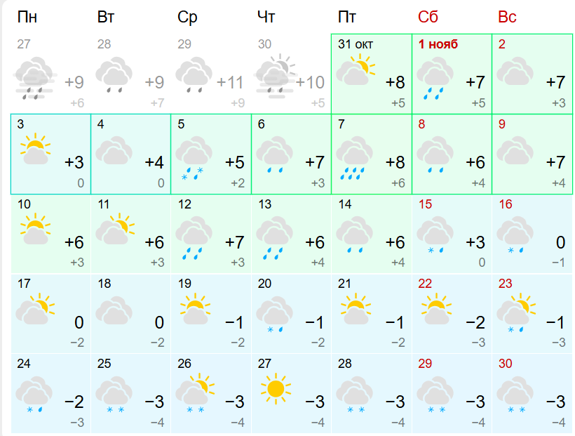 В середине ноября стоит ждать первого устойчивого снега. Температура резко упадет: дневные значения составят +3...+7°, а ночные опустятся до 0...-1°. Дождь будет постепенно смешиваться со снегом, а затем и полностью перейдет в снежную фазу. Условным "днем Х", когда температура окончательно перейдет в минусовой режим и выпавший снег, скорее всего, ляжет, можно считать период 14–16 ноября.
