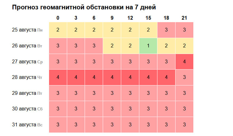 Наиболее неблагоприятная геомагнитная обстановка ожидается 28 августа: в течение всего дня прогнозируется буря уровня 4 балла («малая геомагнитная буря»). Возмущения сохранятся до 31 августа включительно, колеблясь между 3 и 4 баллами. Метеозависимые люди могут ощущать ухудшение самочувствия за несколько дней до и после пика активности.