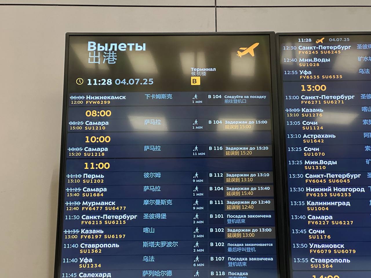 Жители и потенциальные гости 63 региона столкнулись с непредвиденной ситуацией. Время вылета переносили 2 раза. Люди почти 7 часов не могли улететь в областную столицу. Об этом свидетельствуют надписи на информационном табло.