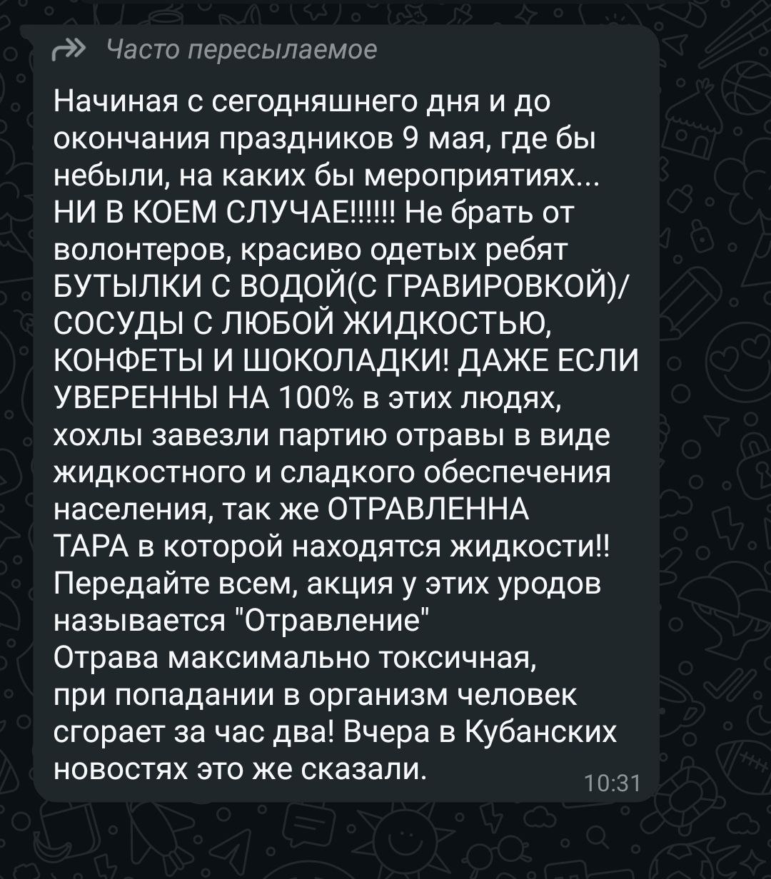По словам экспертов, все это очередная переработка фейка об отравленных духах, взрывающихся подарках волонтеров, отравленной бутилированной воде и гвоздях в таблетках. Цель вбросов — вызвать панику у населения и испортить россиянам грядущий праздник. Не стоит поддаваться на провокацию и помогать врагу, продолжая рассылку, пишет Тг-канал «Война с фейками. Самара».