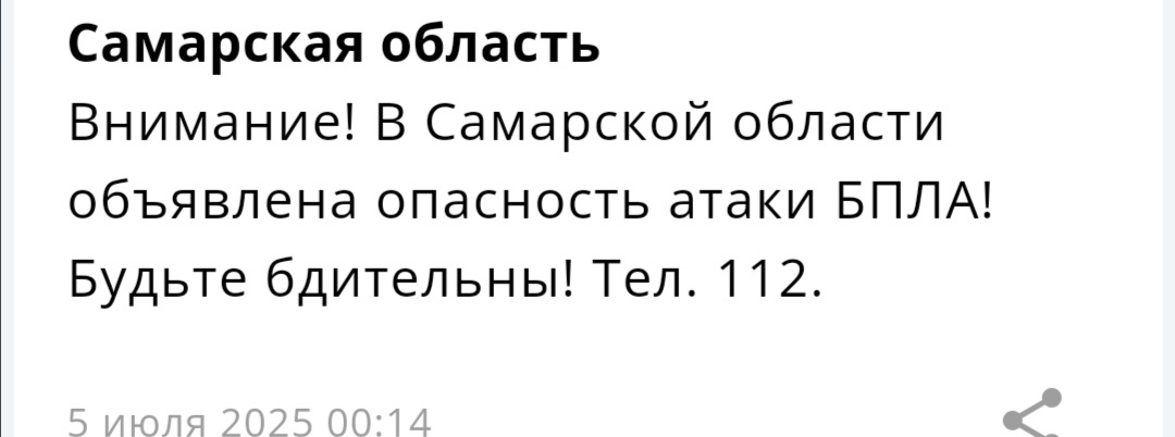 Ночью 5 июля самарцев вновь предупредили о возможной атаке БПЛА. МЧС призывает граждан быть внимательными. Как действовать в подобной ситуации, мы рассказывали неоднократно.