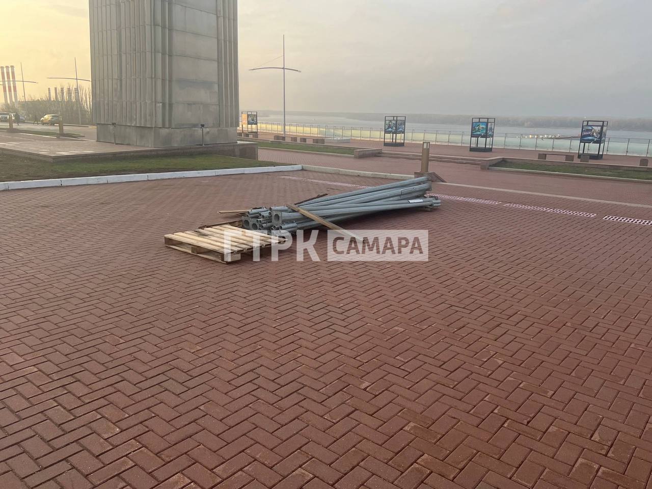 Рядом можно разглядеть детали будущего украшения площади - сложенные в ожидании монтажа опоры освещения и металлические трубы. Возможно, именно из этих элементов в скором времени соберут каркас для новогодней ели.
