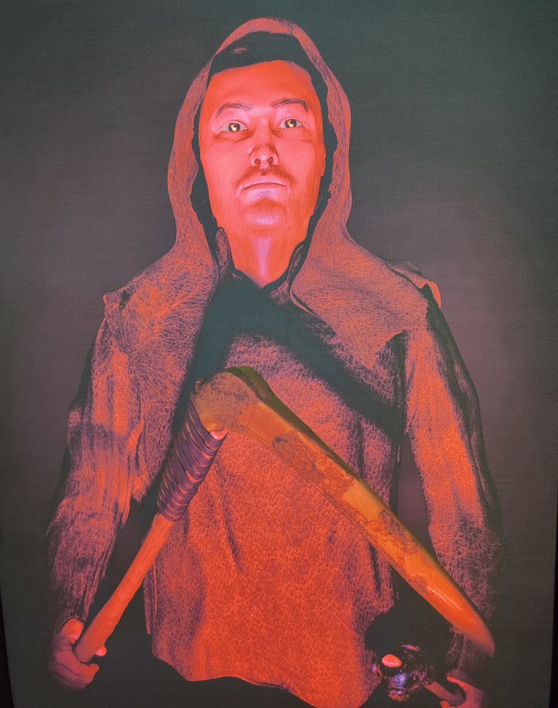 Это эпоха пока еще не конных, а подвижных скотоводов, поэтому на реконструкции человек изображен с пастушьим посохом.