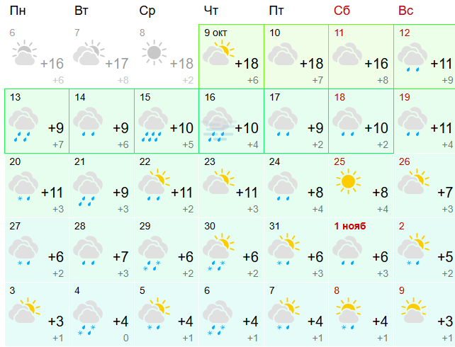 По прогнозом сайта "Гисметео", в субботу, 18 октября, дожди не закончатся и лишь 2 октября выглянет солнце. Выходные 25 и 26 числа тоже не будет осадков, в остальные дни жителям областной столицы рекомендуется брать с собой зонт.