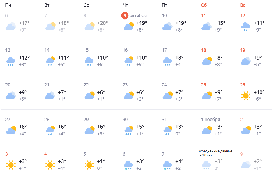 По данным портала "Яндекс Погода", в октябре стоит ждать минимум восемь дождливых дней. Осадки начнутся 12 октября, а их завершение — лишь в следующую субботу, 18-ого. В среднем температура воздуха днем составит +5°C.