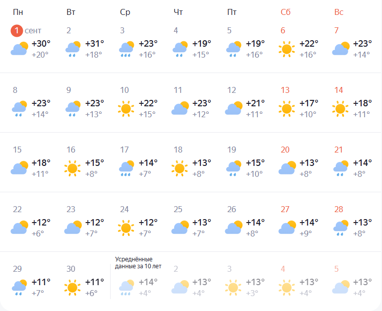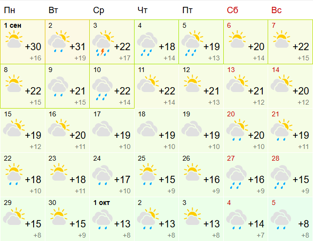 Яндекс.Погода предсказывает похожее развитие событий, разве что значения температуры местами будут чуть ниже на градус-два. Осень придет неспешно, часто радуя облаками на небе и проливными дождями.