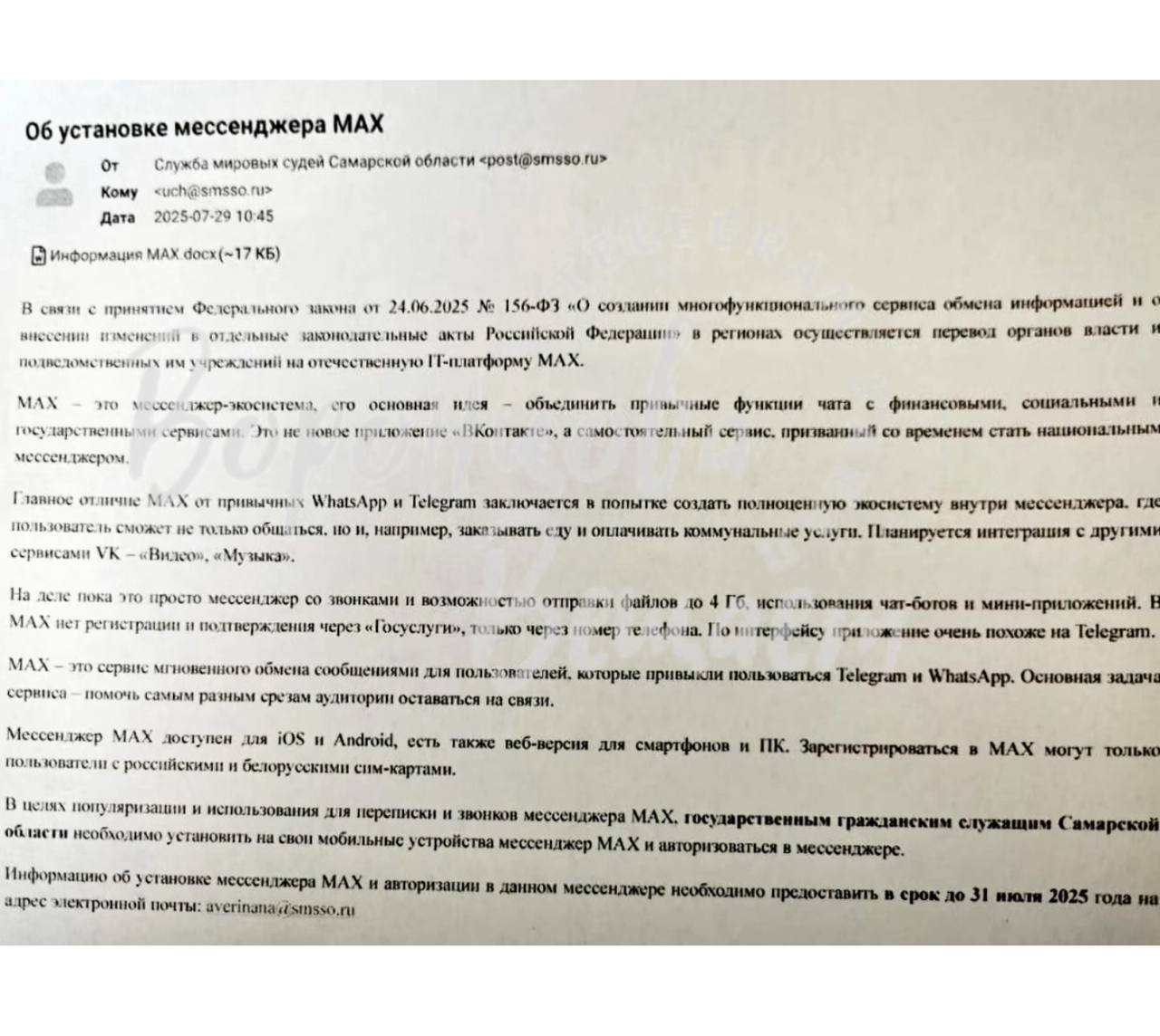 Как говорится в официальном письме Службы мировых судей Самарской области, опубликованным в Telegram-канале «Воронцова вещает», «в целях популяризации мессенджера MAX и дальнейшего его использования для переписки и звонков, государственным гражданским служащим Самарской области необходимо установить мессенджер на свои мобильные устройства и пройти авторизацию. Информацию об установке необходимо предоставить в срок до 31 июля 2025 года». Это позволит перейти на удобный и безопасный канал для переписки и звонков в рабочем формате.