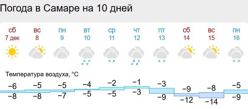 А вот сервис Gismeteo.ru прогнозирует трехдневные снегопады – 10, 11 и 12 декабря. Особенно интенсивными они будут в четверг, 12 декабря. 13 декабря осадки должны прекратится, но в Самарскую область придет резкое похолодание, температура может опуститься до -12 градусов.