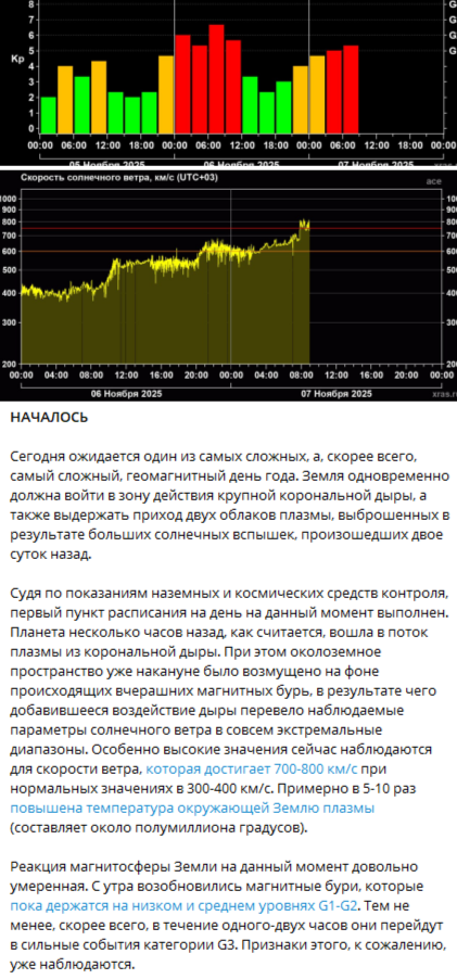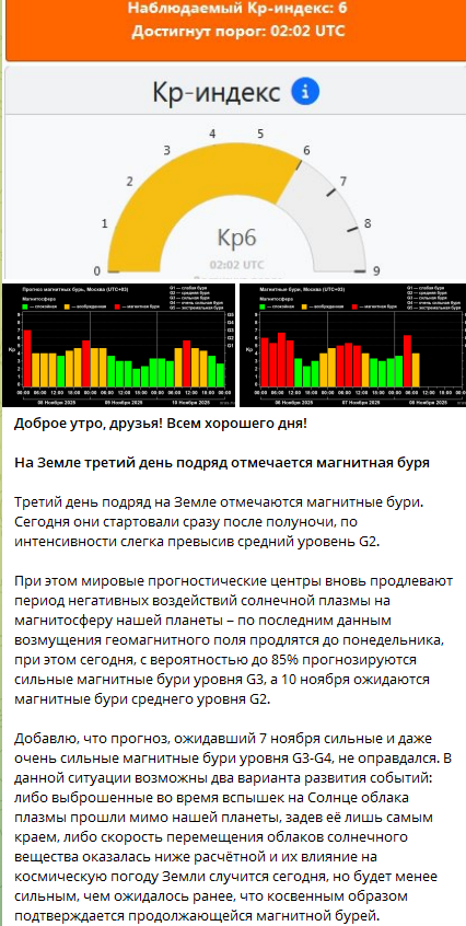 "Мировые прогностические центры вновь продлевают период негативных воздействий солнечной плазмы на магнитосферу нашей планеты – по последним данным возмущения геомагнитного поля продлятся до понедельника, при этом сегодня, с вероятностью до 85% прогнозируются сильные магнитные бури уровня G3, а 10 ноября ожидаются магнитные бури среднего уровня G2", - рассказывает эксперт в своем телеграм-канале.