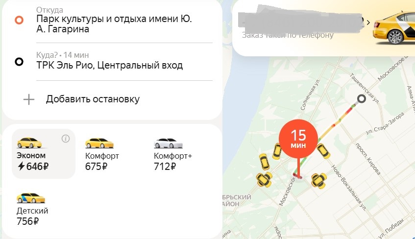 Службы такси также резко подняли расценки. Например, проезд от парка Гагарина до ТЦ Эль Рио в вечерний час-пик стартовал от 646 рублей в экономе.