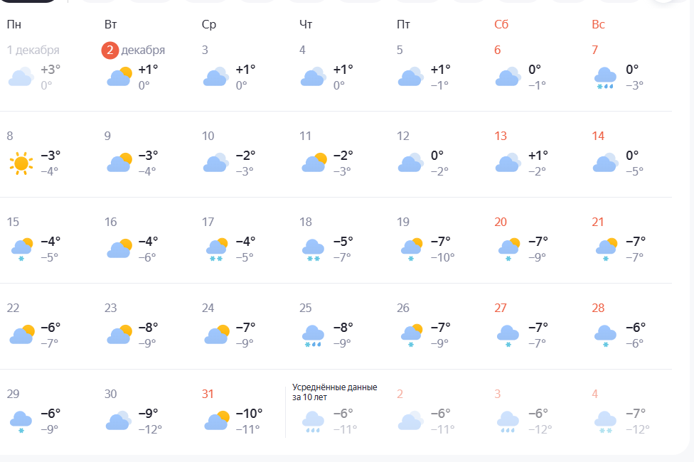 По данным портала Яндекс, снег стоит ждать 7, 15, 17-21 декабря. К новому году осадки будут выпадать почти каждый день, а температура воздуха заметно опустится: в среднем до -7°C днем.