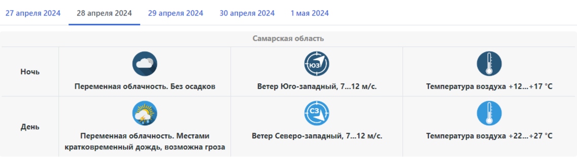 Самарские же синоптики в воскресенье, 28 апреля, прогнозируют днем +22...+27°C, ночью +12...+17°C. Местами кратковременный дождь, возможна гроза. Юго-западный ветер со скоростью 7...12 м/с, который днем сменится на северо-западный.