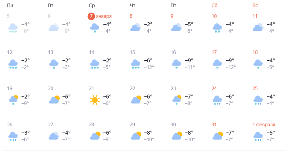 По данным портала Яндекс Погода, столбики термометров в этом месяце не покажут отметку ниже -10. Самыми холодными днями в январе станут пятница и суббота, 16 и 17 января. После этого ожидается небольшое потепление, а 21 числа обещают солнечную погоду. А вот самой снежной станет неделя с 12 января. Осадки будут идти вплоть до 19 января.