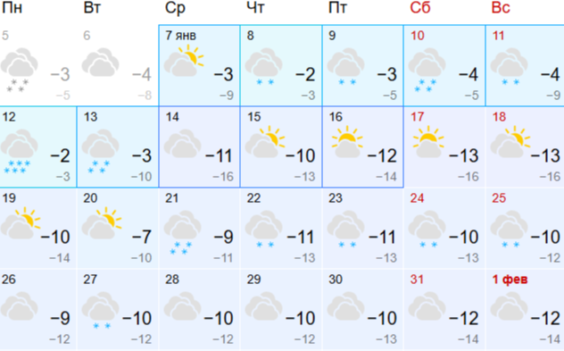 Данные портала "Гисметео" не сильно отличаются о предыдущего источника. Однако,по мнению экспертов, последние дни января станут значительно холоднее, в среднем -11 днем.