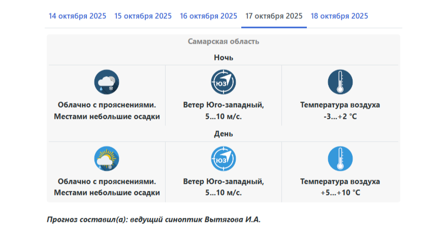 Уже в пятницу, 17 октября синоптики ожидают выпадение первых осадков в ночное время. Синоптики в инфографику прогноза уже поставили значок «снежинка». Зато днём, будет солнечная и относительно тёплая погода от +5 до +10 градусов.