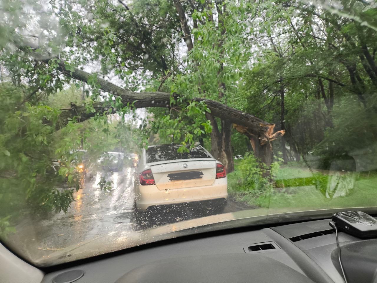 В МЧС рекомендуют пешеходам не укрываться под деревьями и шаткими конструкциями, а автомобилистам внимательно выбирать места для парковки. Во вторник одна из веток рухнула на крышу машины, оставленной рядом с домом по пр. К. Маркса, 298.