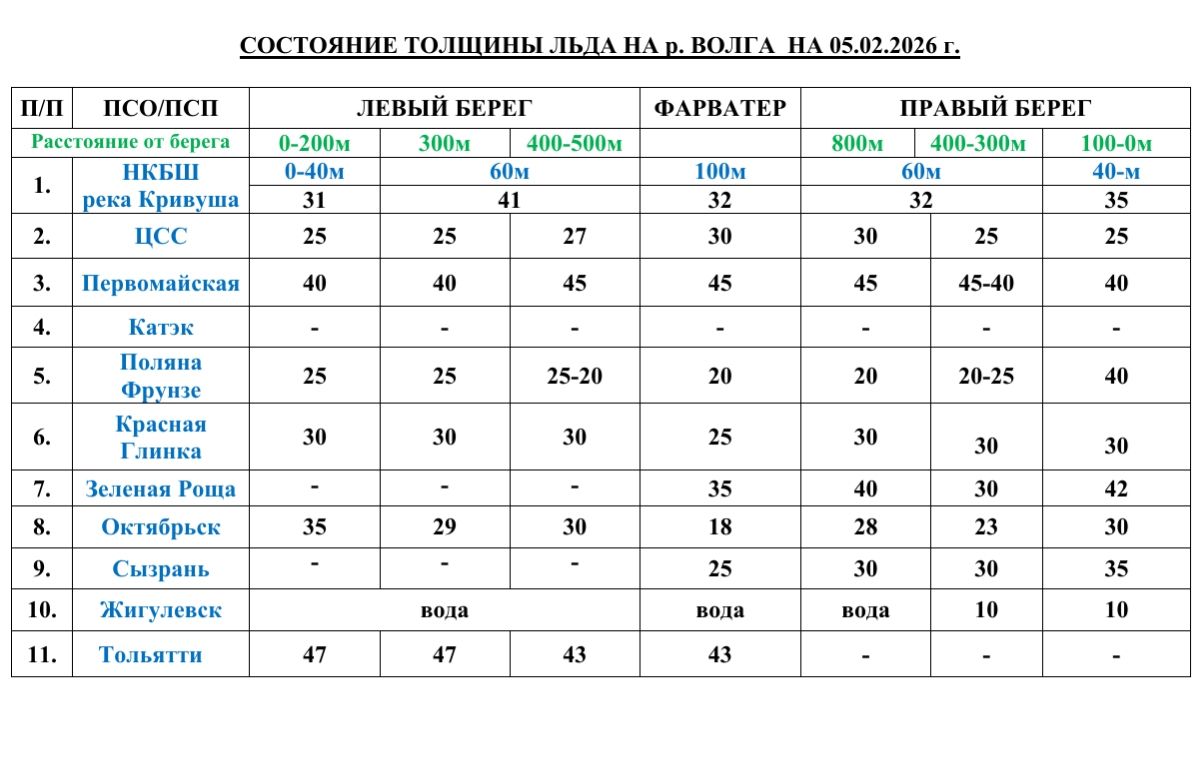 На 5 февраля 2026 года специалисты провели замеры толщины льда на различных участках реки Волги в Самарской области. Результаты исследований представлены в виде детальной таблицы по районам и расстояниям от берега.