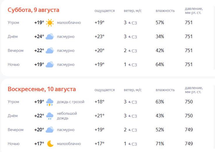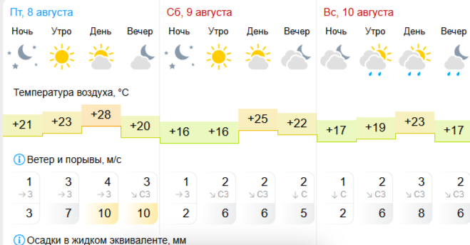 Во многом схож прогноз и у сайта "Гисметео". Только в воскресенье, 10 августа, будет немного потеплее - +23 днем.