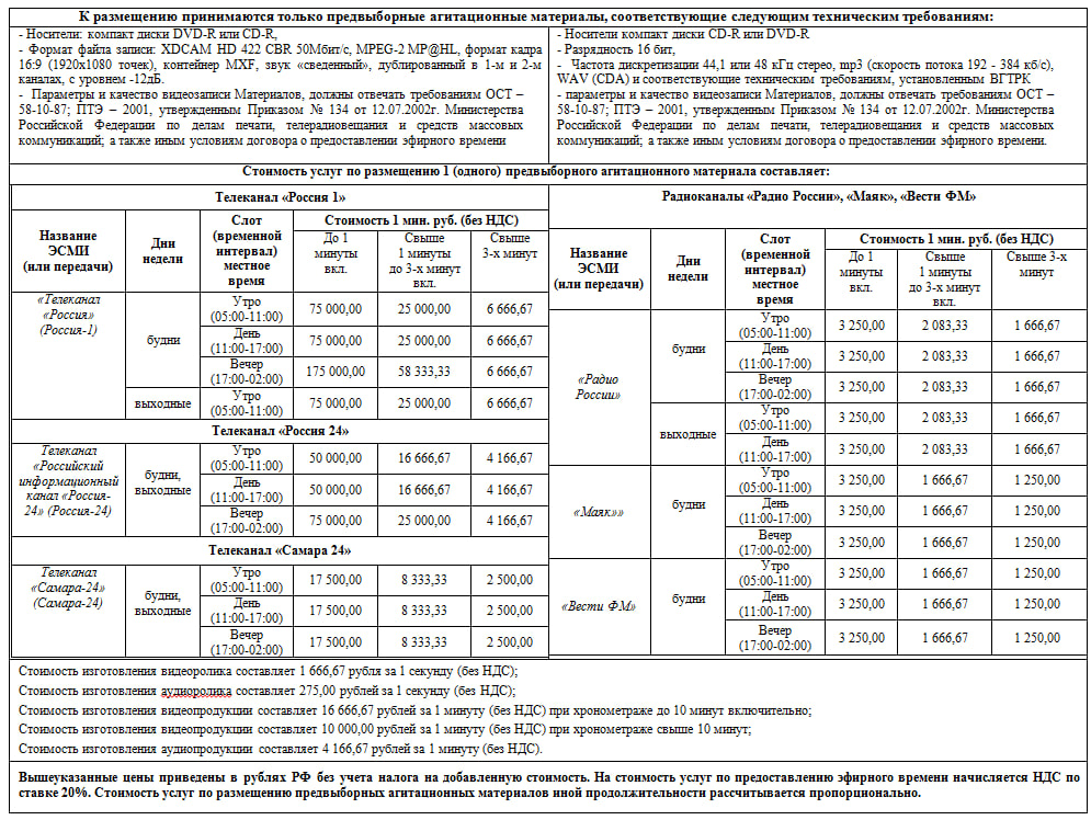 Филиал федерального государственного унитарного предприятия «Всероссийская государственная телевизионная и радиовещательная компания» «Государственная телевизионная и радиовещательная компания «Самара» (далее - ГТРК) объявляет сведения о размере и условиях оплаты, а также иных условиях размещения предвыборной агитации в период с 16 августа 2025 г. до 23:59 часов 11 сентября 2025 г. (включительно) по выборам депутатов Думы городского округа Самара восьмого созыва в региональном эфире общероссийских обязательных общедоступных телеканалов «Телеканал «Россия» (Россия – 1)», «Российский Информационный Канал «Россия - 24» (Россия – 24)», круглосуточного телеканала «Самара - 24» (Самара - 24) и радиоканалов «Радио России», «Маяк», «Вести ФМ»: