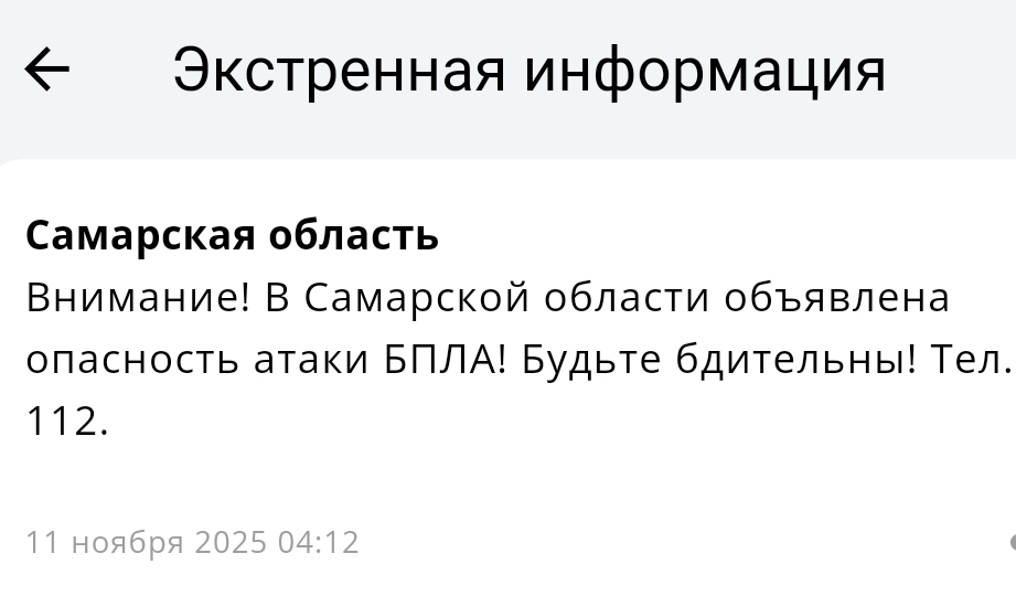 11 ноября в Самарской области в 4 часа 12 минут была объявлена опасность атаки вражеских беспилотников. Об этом жителям региона сообщили в специальном приложении МЧС России.