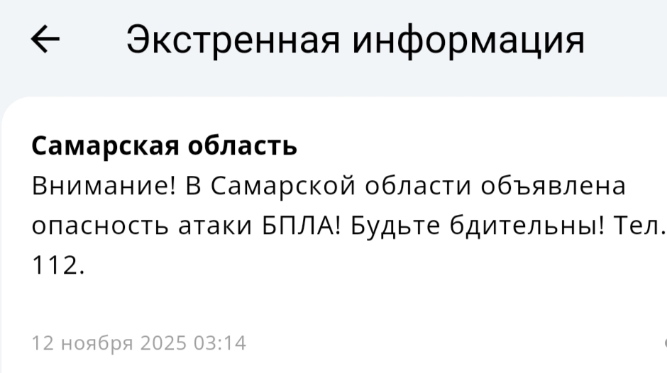 В среду, 12 ноября, в Самарской области в 3 часа 14 минут была объявлена опасность атаки вражеских беспилотников. Об этом жителям региона сообщили в специальном приложении МЧС России.