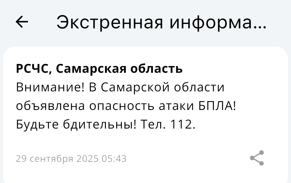 29 сентября, в понедельник, в 5:43 утра жителям Самарской области было разослано сообщение МЧС об угрозе атаки БПЛА.