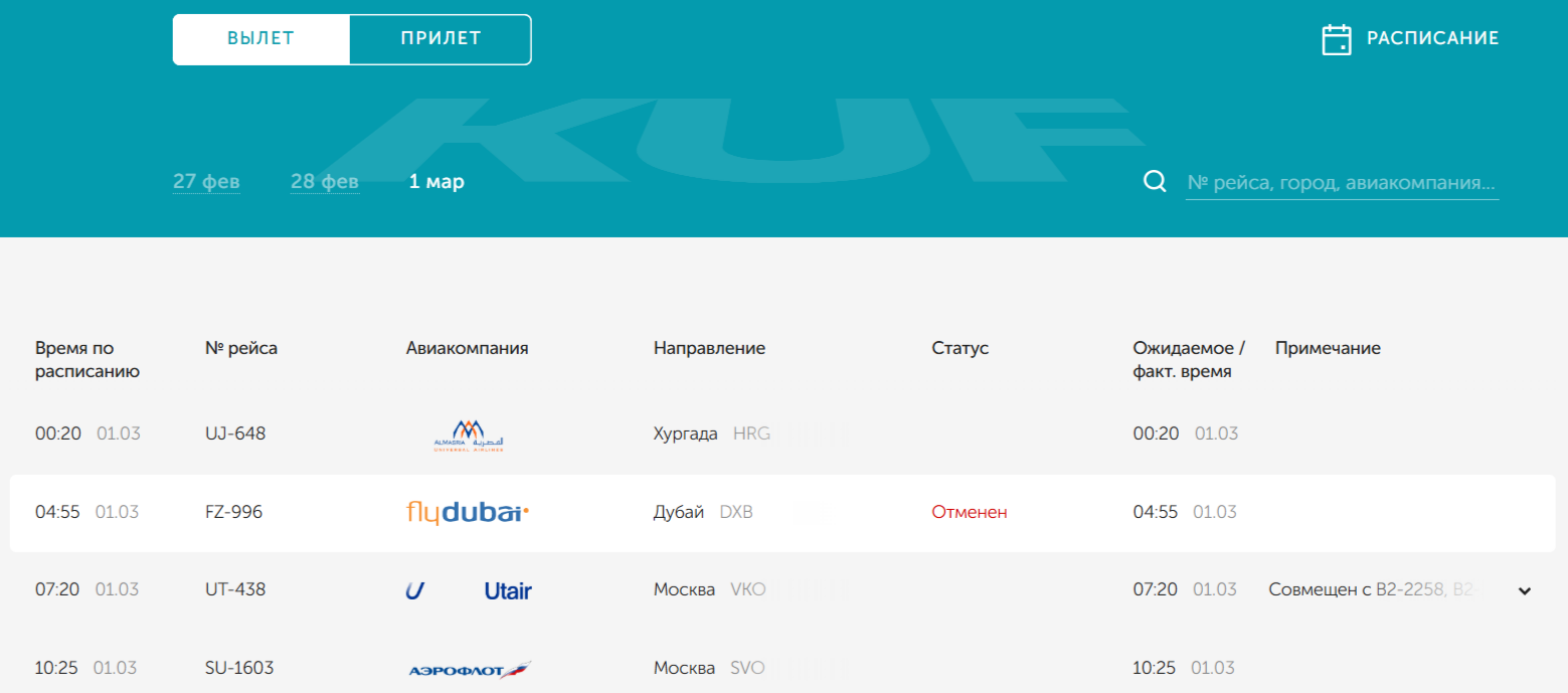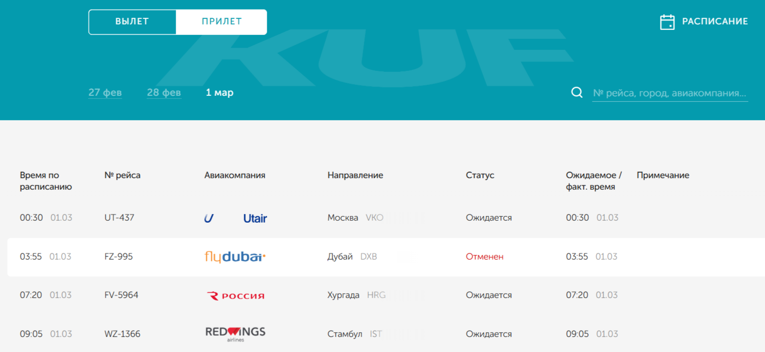 Стало известно, что 1 марта в аэропорту Курумоч не состоятся два рейса в Объединенные Арабские Эмираты и обратно. Один рейс должен был прилететь ночью в 3.55, а другой вылететь в Дубай рано утром в 4.55, а второй.