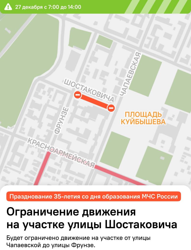 Запрет на движение транспорта на улице Шостаковича в Самаре будет введен 27 декабря с 7.00 до 14:00. В это время будет закрыт проезд по улице Шостаковича на участке от улицы Фрунзе до улицы Чапаевской. Ограничения затронут все виды транспорта, включая средства индивидуальной мобильности.