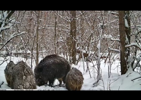 В лесу под Самарой фотоловушка сняла семейство кабанов в поисках еды под снегом