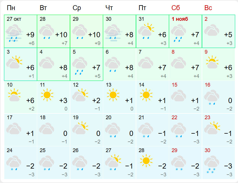 Уже с 11 ноября температура начнет плавно снижаться: сначала до +3 °C, а затем и до нуля. А с 20 числа средняя температура днем опустится ниже нуля и перейдет в отрицательные значения. В этот период ожидаются осадки в виде снега и дождя. К концу месяца дневная температура может опуститься до -3 °C.