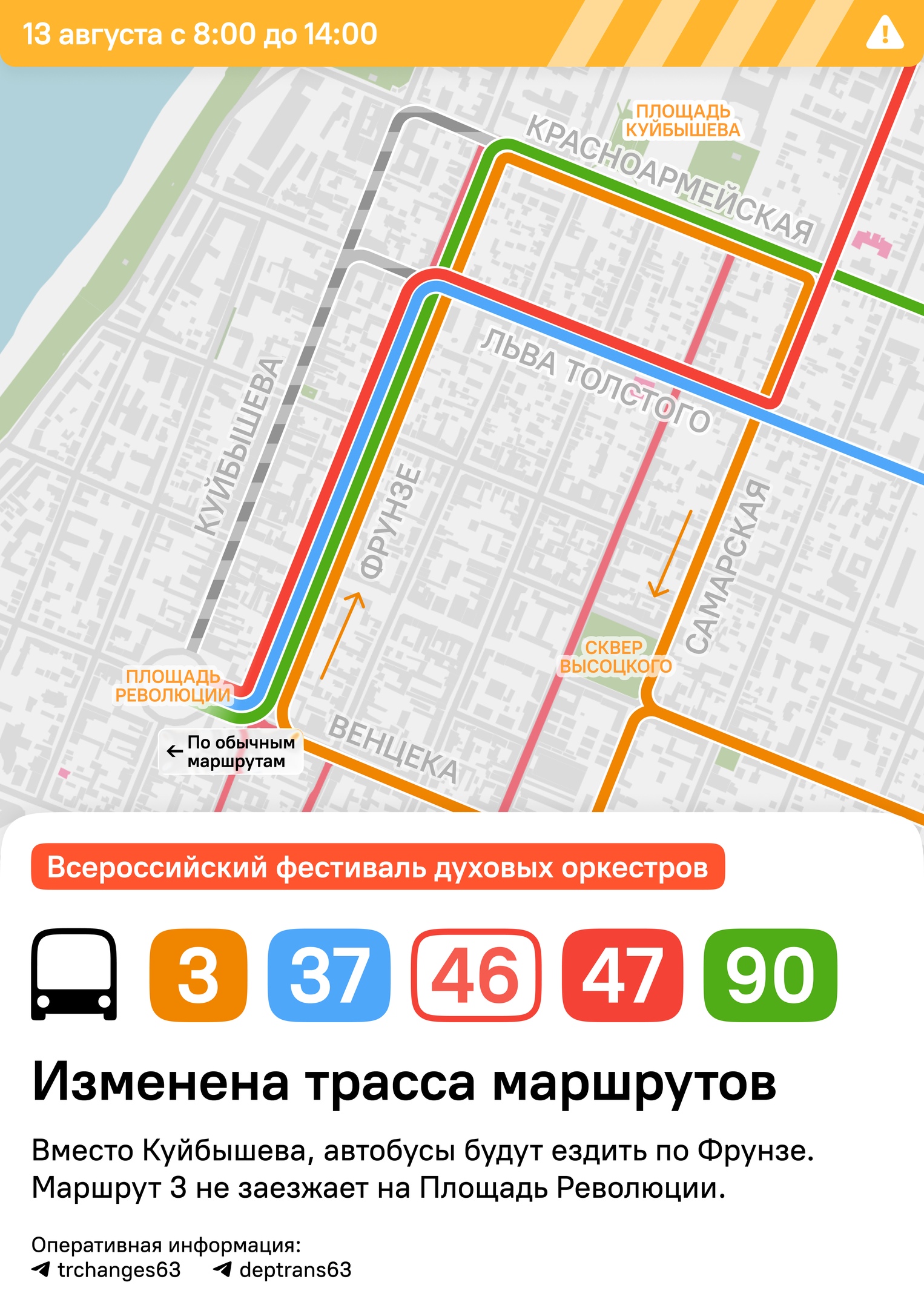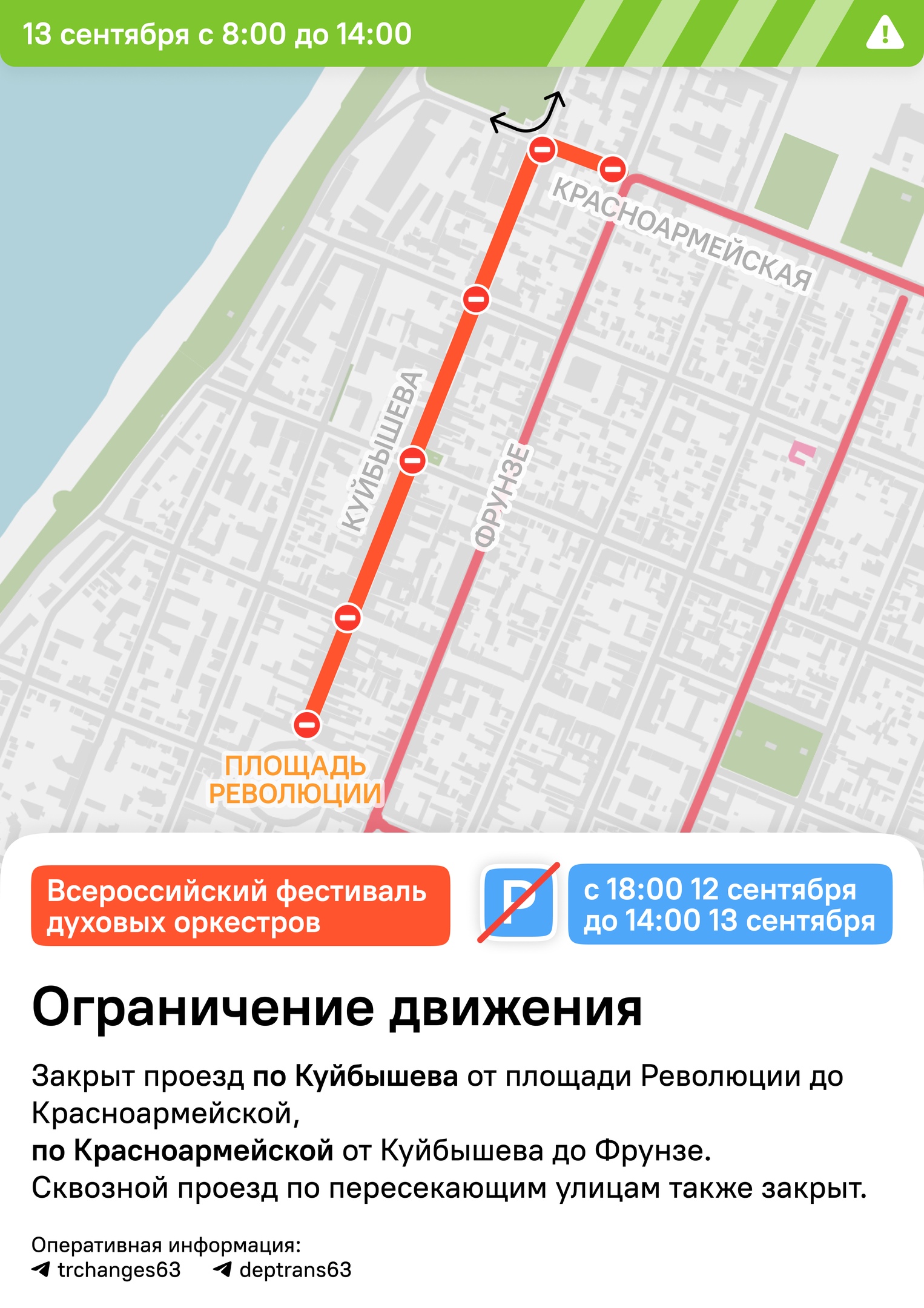 В Самаре 13 сентября ограничат движение транспорта из-за парада духовых оркестров
