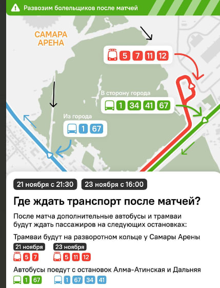 21 ноября в 21:30 и 23 ноября в 16:00 восемь дополнительных автобусов №1, №34, №41 и №67 от "Самара Авто Газ" будут ждать болельщиков возле "Мерседес-центра" на дублере Московского шоссе и отправятся в город.