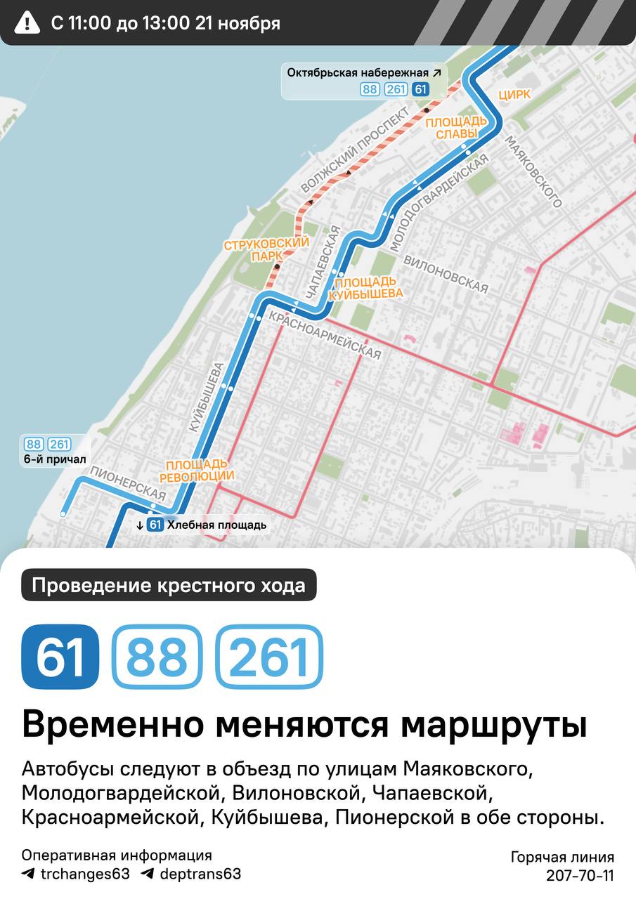 21 ноября 2025 в Самаре состоится Крестный ход, посвящённый Собору Архангела Михаила и всех небесных сил бесплотных. В этот день временно изменятся маршруты движения транспорта в историческом центре города