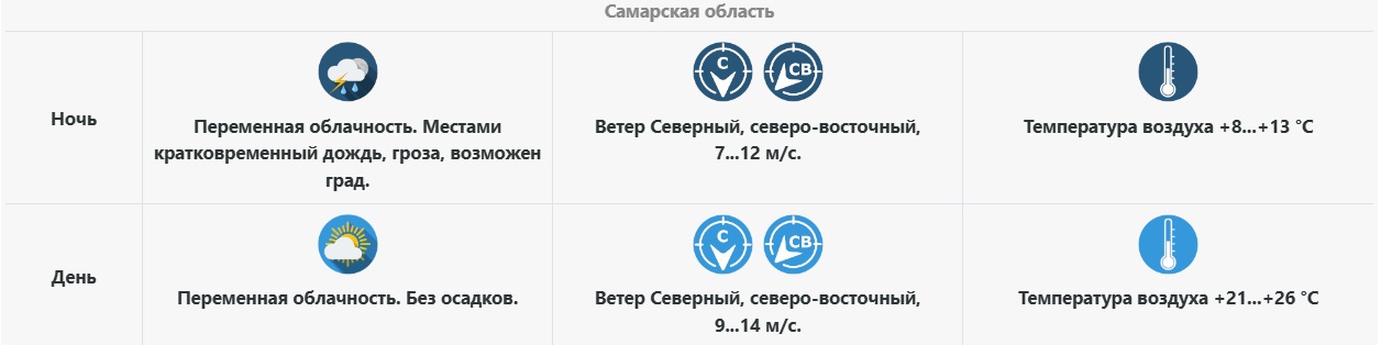 Температура ночью опустится до +8...+13 °C. Также ожидаются грозы, кратковременные дожди и переменная облачность. Местами возможен град. Порывы ветра будут достигать 7...12 м/с. В связи с этим объявлен желтый уровень опасности.