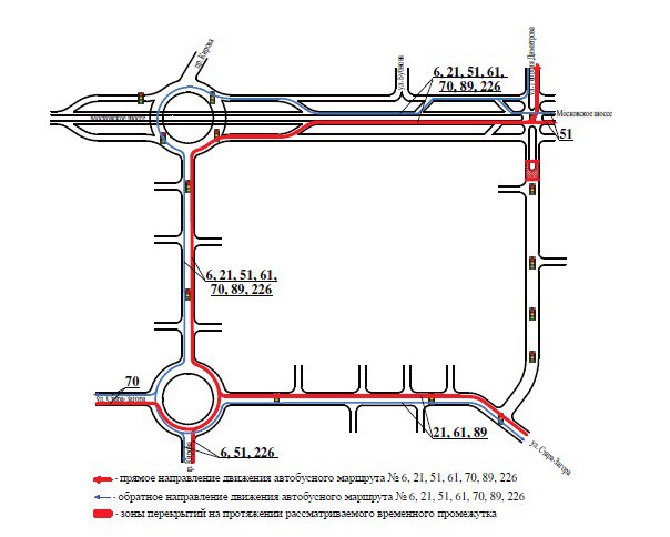 • Автобусы маршрута № 226 – от остановки "Улица Стара-Загора" на проспекте Кирова – прямо по проспекту Кирова в направлении Московского шоссе – с поворотом направо на дублер проезжей части по Московскому шоссе, с дальнейшим выездом (после остановки "Площадь авиаконструктора Ильюшина") на проезжую часть Московского шоссе и движением в направлении улицы Георгия Димитрова – поворот налево на проезжую часть улицы Георгия Димитрова.