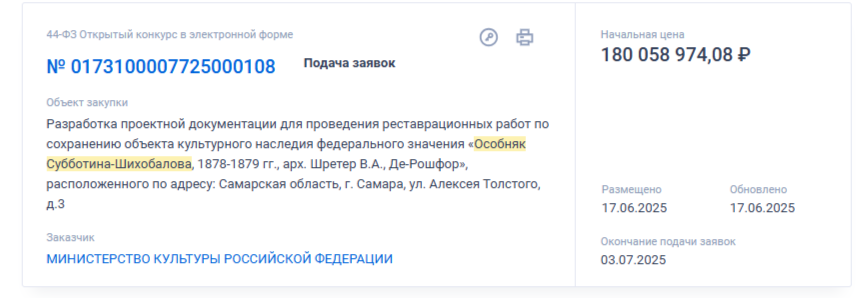 Министерство культуры Российской Федерации объявило конкурс на проведение реставрационных работ в историческом здании, известном как «Особняк Субботина-Шихобалова».