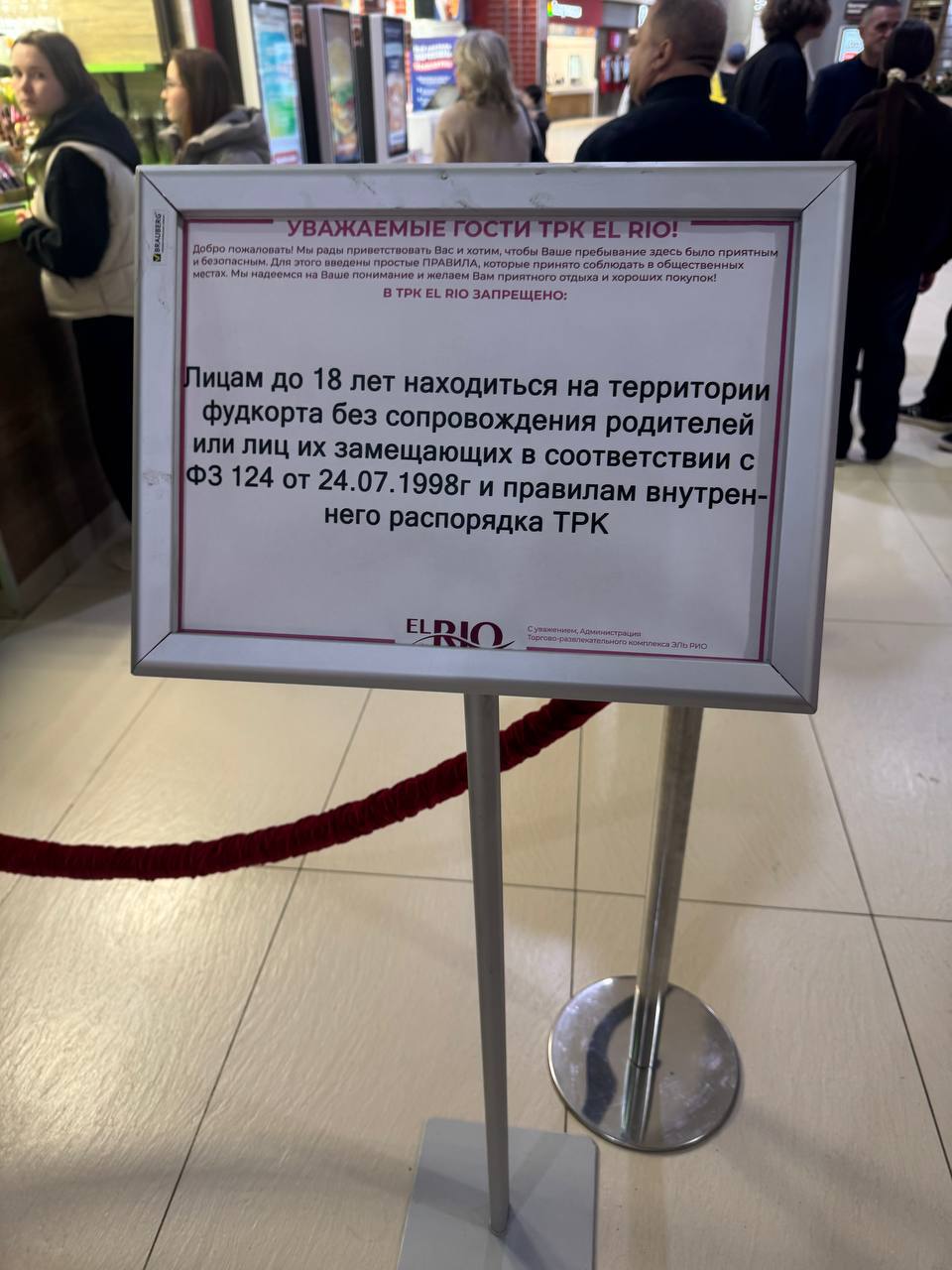 Один из самарцев, посетивший торговый центр «Эль-Рио», пожаловался на запрет для детей до 18 лет посещать фуд-корт без сопровождения взрослых. Он также приложил к жалобе фото информационной доски, на которой указано, что лицам младше 18 лет запрещено находиться на территории фудкорта без родителей или лиц, их замещающих. По информации от Екатерины Мизулиной, такие меры были введены из-за участившихся случаев драк и конфликтов среди молодёжи на фудкортах.