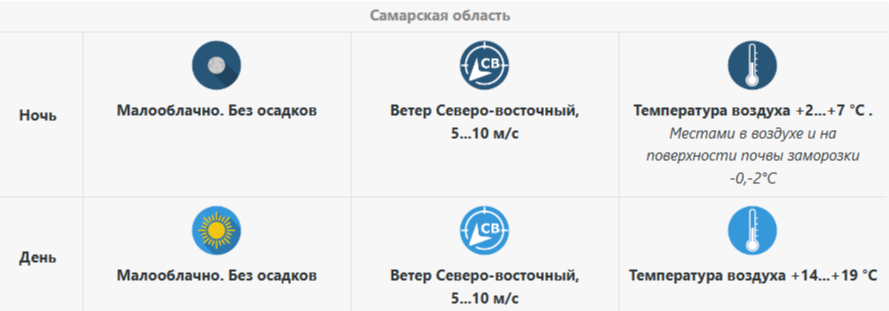 По данным Приволжского УГМС, днём будет относительно тепло и комфортно: воздух прогреется до +14…+19 °C. Небо будет малооблачным, без дождей. Однако ночью температура резко опустится до +2…+7 °C, а местами, особенно в низинах и на поверхности почвы, возможны заморозки до -0…-2 °C.
