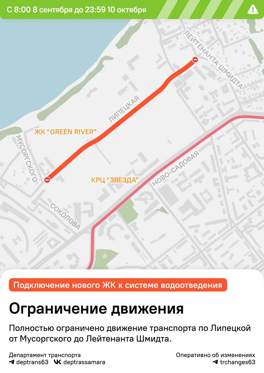 В Самаре с 8 сентября до 10 октября перекроют ул. Липецкую