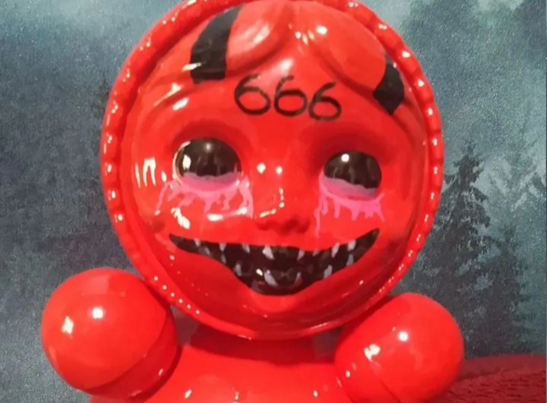 Высота игрушки 26 см, и ее облик весьма своеобразен: на лбу выгравированы три "шестерки", а лицо искажено пугающей ухмылкой с черными зрачками. Маловероятно, что ребенок будет в восторге от такой забавы. Самарец оценил это творение в 669 рублей.